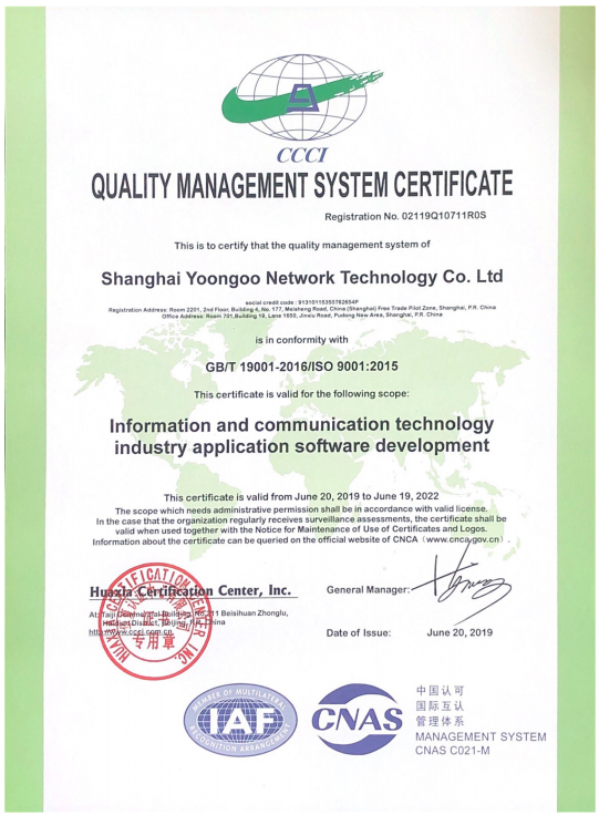 In 2019, Shanghai Yoongoo Network Technology Co., Ltd. was certified and awarded the ISO9001 Certificate for Software Development in Information and Communication Technology (ICT) .
