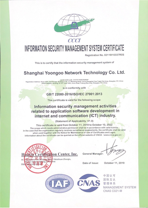 In 2019, Shanghai Yoongoo Network Technology Co., Ltd. was certified and awarded the ISO27001 Certification for Information Security Matters in Software Development in Information and Communication Technology (ICT).